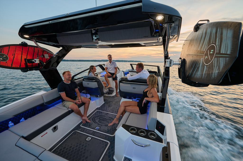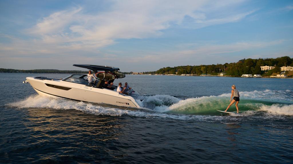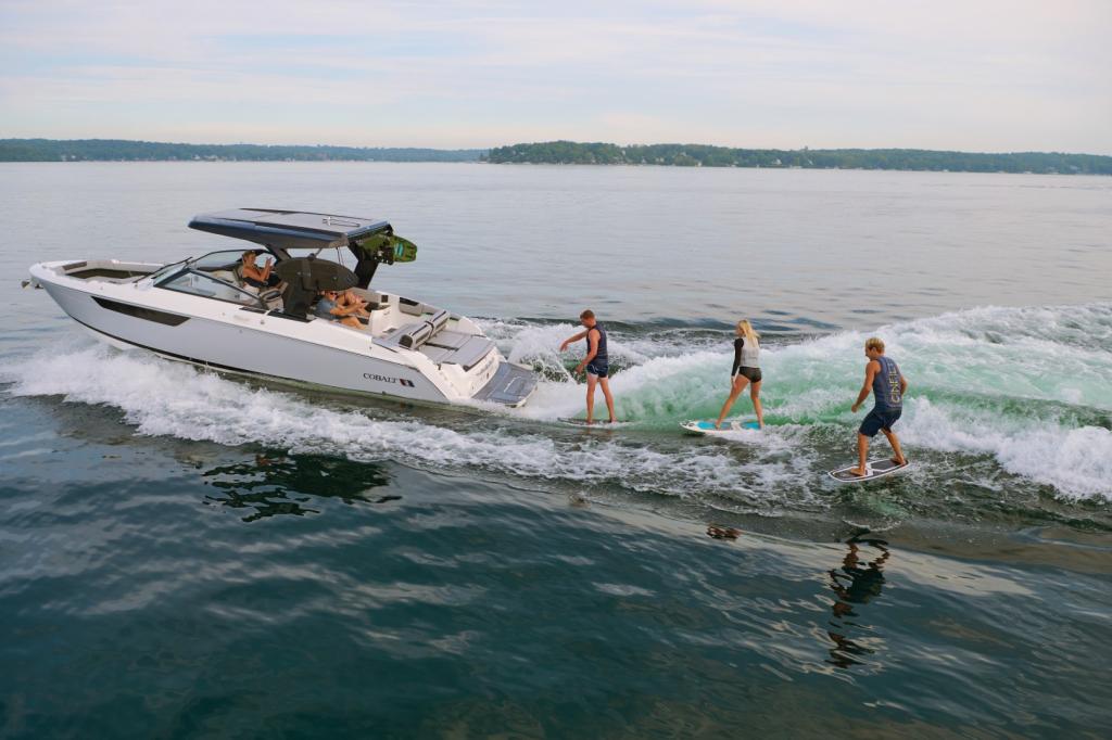 Cobalt’s Surf Series seamlessly integrates Surf Gate™ with a custom-designed surf hull, all powered by Volvo Penta. Nearly all boats in the series employ traditional hard ballast tanks for wave customization. The R31, R33 and R35 Surf models adopt a streamlined design without ballast tanks. This tailored approach ensures agility and simplicity, redefining expectations for surfing enthusiasts across the entire Surf Series.